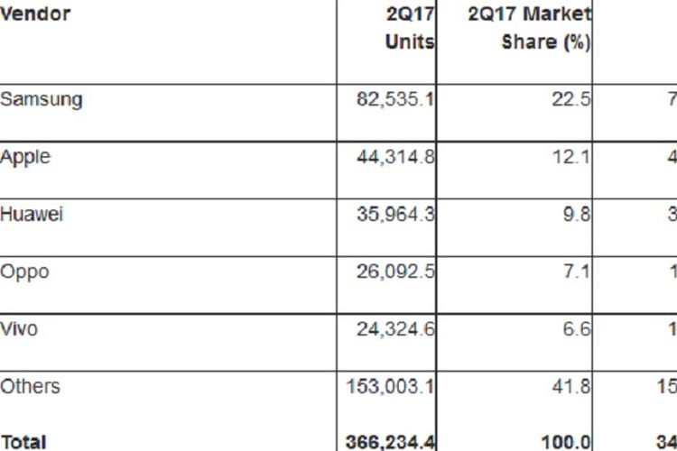 Tak kurang dari 366,2 juta unit smartphone terjual sepanjang kuartal kedua 2017. Angka itu meningkat 7,6 persen dari tahun ke tahun.